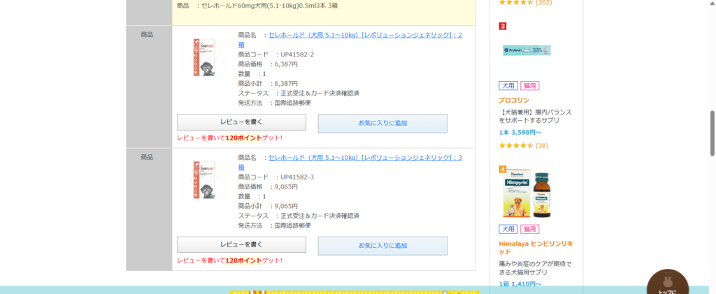 同じ商品を探したい場合は、「セレホールド」で検索すると犬用・猫用が体重別に出てきます。